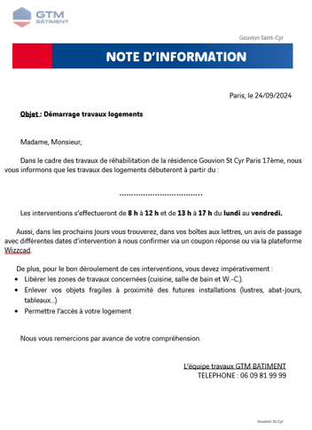 À l’issue des travaux dans votre logement, l’entreprise GTM Bâtiment vous contactera. Votre présence est préférable. À cette occasion, vous pourrez faire part à l’équipe travaux et à l’architecte des anomalies que vous avez observées.